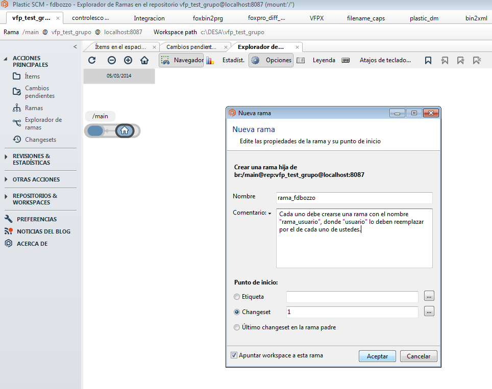 Y ahora sí, teniendo cada uno su propia rama, se puede comenzar a trabajar en la tarea, lo que normalmente es abrir una sesión de FoxPro en el directorio del workspace y comenzar a trabajar.
